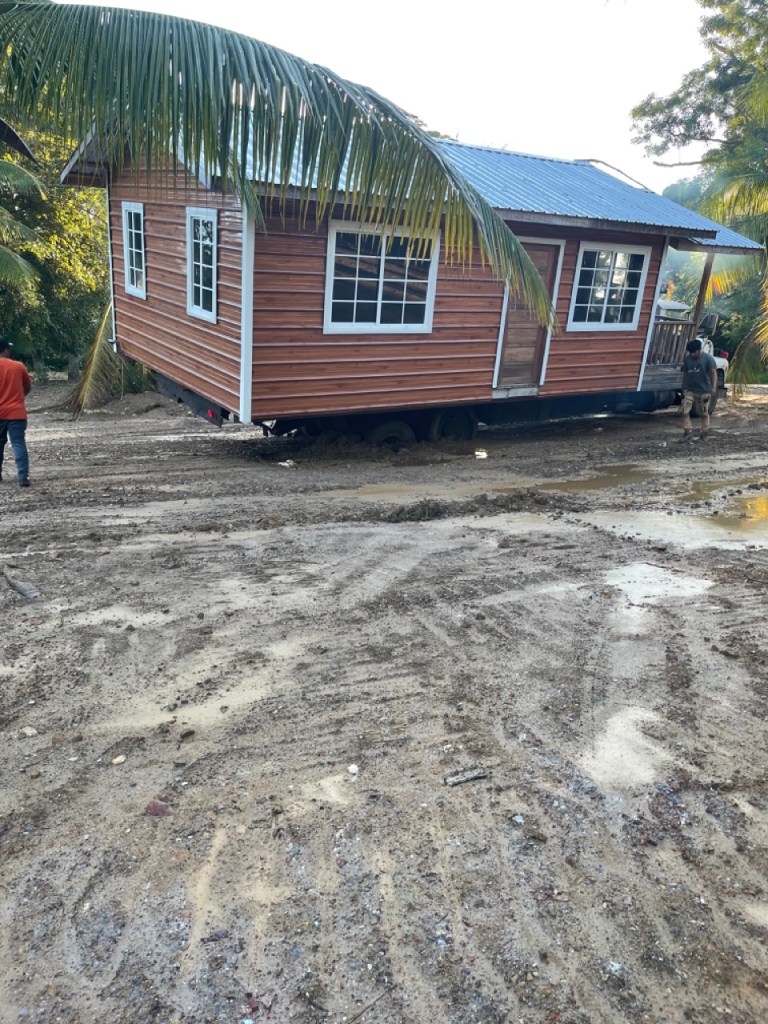 We met the men in the village and they followed us to the property. I showed them where I wanted the house placed and they began to back into the space. Then they sunk! Not just a little bit either, the entire back tire sunk into the mud and the house almost tipped over. I gasped in horror, but apparently this is normal in Belize and the men had it covered. Slowly but surely using chain and a coconut tree, they got that tire out of the mud and freed the truck, but there was no way the house could be placed where I wanted it. The hole left by the tire was five feet deep and could not easily be filled. So I had to choose a new spot on the fly. It wasn’t what I envisioned, but really none of this has been what I envisioned, so I abandoned my Type A concerns and went with the flow.
