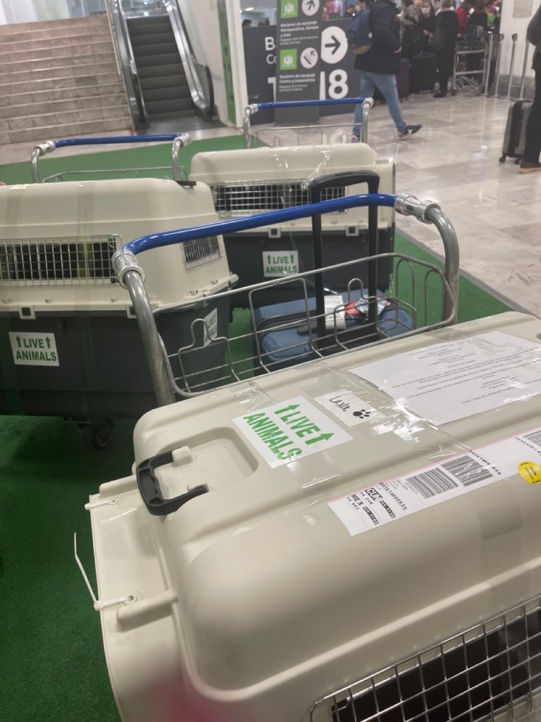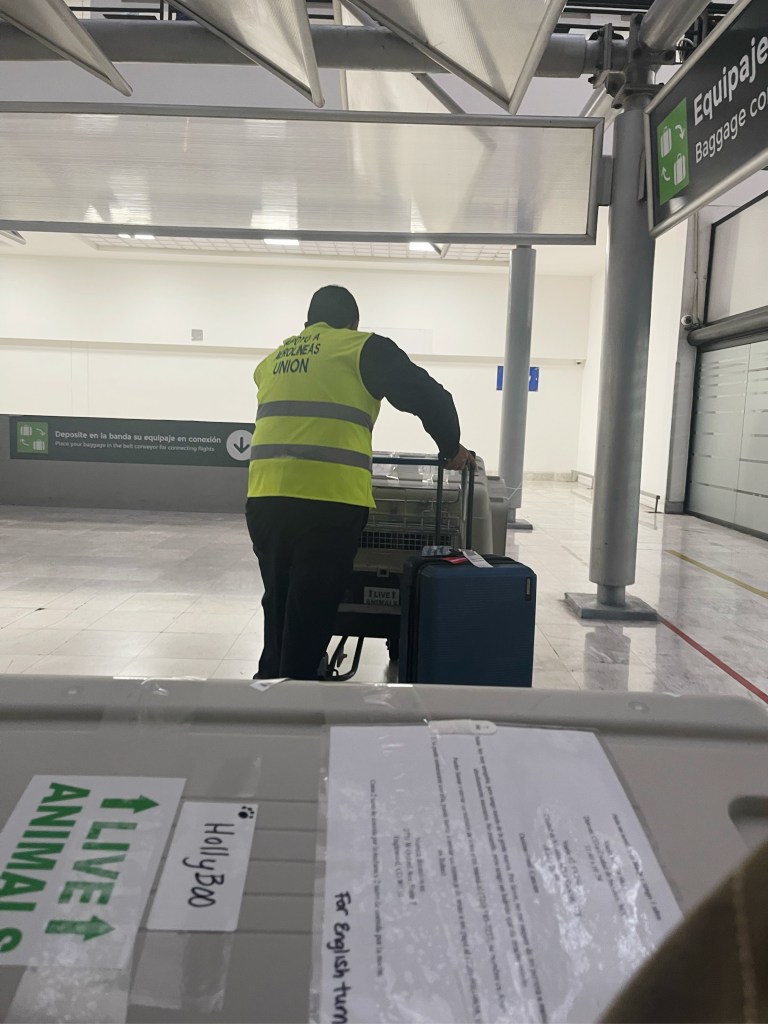 I made sure that all of my dogs were wearing AirTags so I knew they were onboard, and we flew to Mexico City. When we got there, there wasn’t a sign in English or anyone who spoke English, so I got Lezlay, my warehouse guy’s wife on the phone. Thank God, she speaks fluent Spanish and was willing to help. She knew that I was terrified of this leg of the trip. She told me to find someone and give them the phone. I don’t know exactly what she said, but that man walked me to every single checkpoint and inspection area with the dogs and the luggage, and helped me get them rechecked for the connecting flight. It was a life saver.