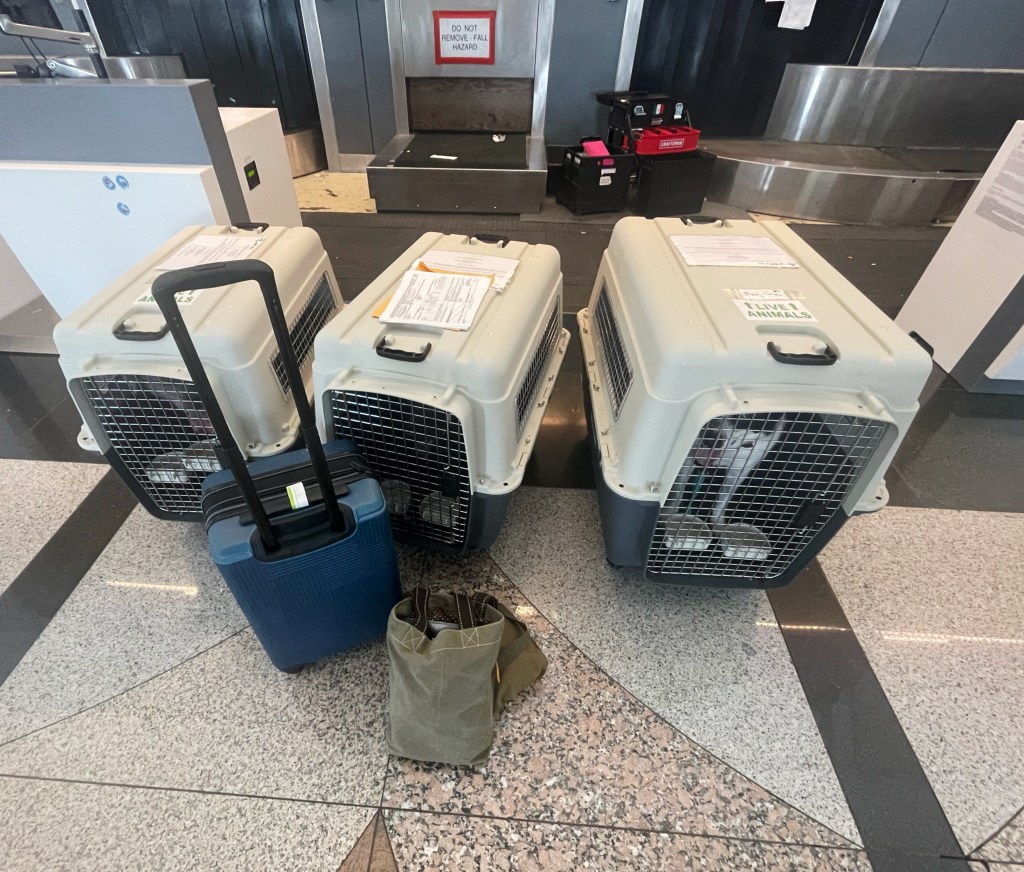 On the morning of the flight my daughter Katy drove me and the dogs to the airport at 7:00 am in one of the rescue’s transport vans. This was the only vehicle that could accommodate all three of the crates and luggage.